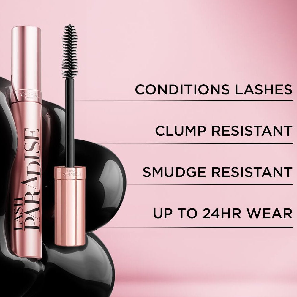 Take your lashes to paradise with L'Oreal Paris Lash Paradise mascara. Delivers intense volume and spectacular lash length with the most pleasurable application experience. The whipped volumizing formula creates intense lash volume and dramatic length and is enriched with nourishing castor oil for soft, supple lashes without any flaking or clumping. The feather-soft wavy brush applicator is gentle for extreme comfort around sensitive eye areas.