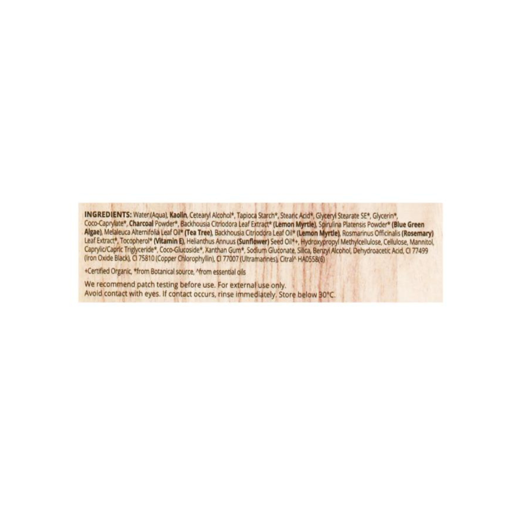 Caprylate*, Charcoal Powder*, Backhousia Citriodora Leaf Extract* (Lemon Myrtle), Spirulina Platensis Powder* (Blue Green Algae), Melaleuca Alternifolia Leaf Oil* (Tea Tree), Backhousia Citriodora Leaf Oil* (Lemon Myrtle), Rosmarinus Officinalis (Rosemary) Leaf Extract*, Tocopherol* (Vitamin E), Helianthus Annuus (Sunflower) Seed Oil*+, Hydroxypropyl Methylcellulose, Cellulose, Mannitol, Caprylic/Capric Triglyceride*, Coco-Glucoside*, Xanthan Gum*, Sodium Gluconate, Silica, Benzyl Alcohol, Dehydroacetic Acid, CI 77499 (Iron Oxide Black), CI 75810 (Copper Chlorophyllin), CI 77007 (Ultramarines), Citral^ +Certified Organic, *from Botanical source, ^from essential oils Australian Made and Owned, 100% Vegan, Halal, Not Tested on Animals, NO Sulfates (SLS, SLES, ALS, ALES), Parabens, Silicones, Gluten, Ethoxylated cleansers, PEG’s, Phthalates, Mineral oil, Artificial colours, Synthetic fragrances, Animal derivates.