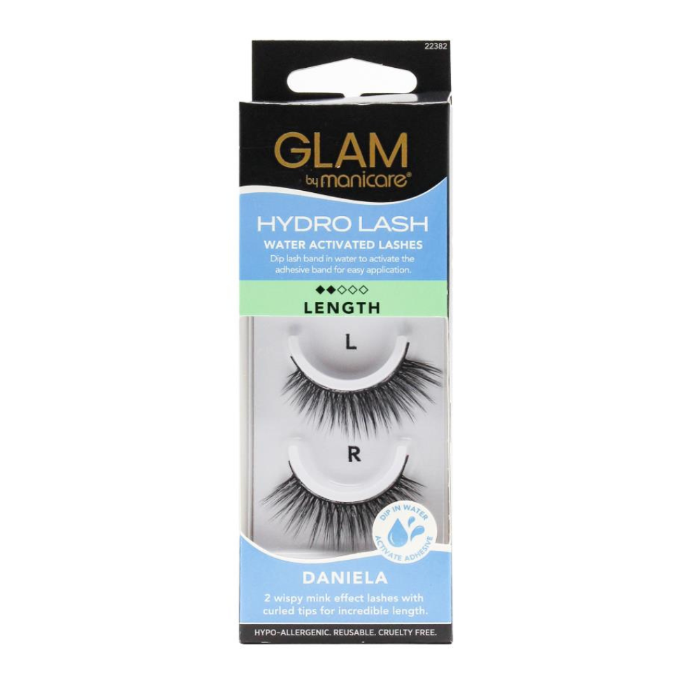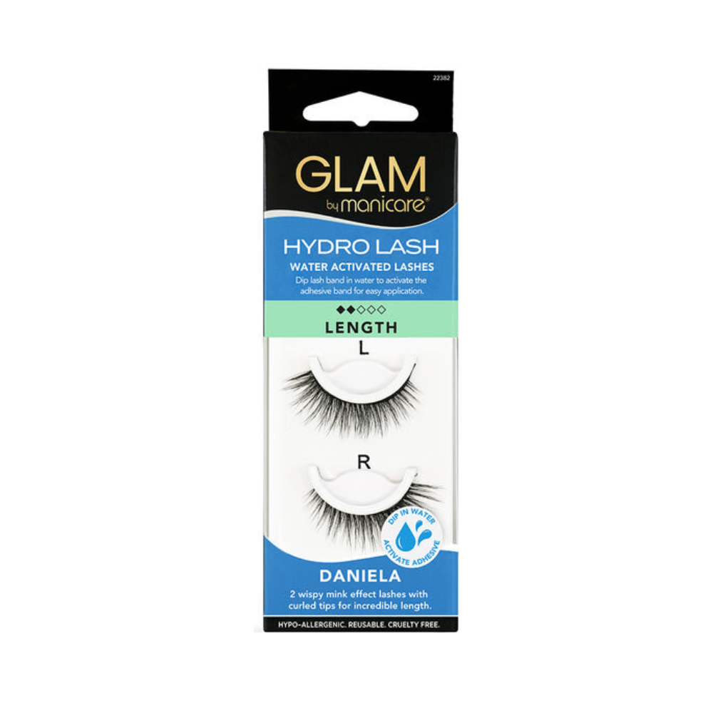 Glam By Manicare® HYDRO LASH uses a revolutionary water activated band for effortless application without the need to apply lash adhesive. Simply dip lash band in water to activate the adhesive and apply onto lash line. Designed for long lasting wear and a lightweight finish. From a natural finish to a dramatic lash effect, Glam By Manicare® has lashes to suit every occasion.