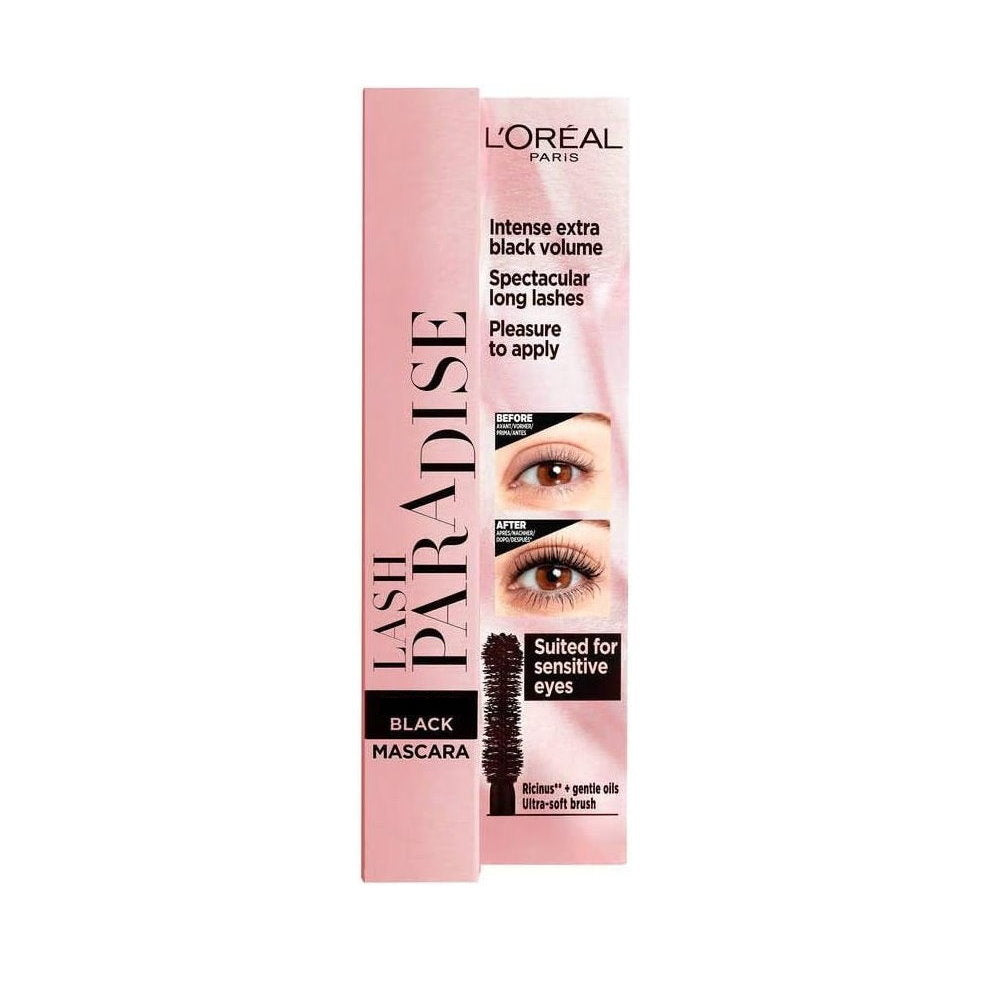 Take your lashes to paradise with L'Oreal Paris Lash Paradise mascara. Delivers intense volume and spectacular lash length with the most pleasurable application experience. The whipped volumizing formula creates intense lash volume and dramatic length and is enriched with nourishing castor oil for soft, supple lashes without any flaking or clumping. The feather-soft wavy brush applicator is gentle for extreme comfort around sensitive eye areas.