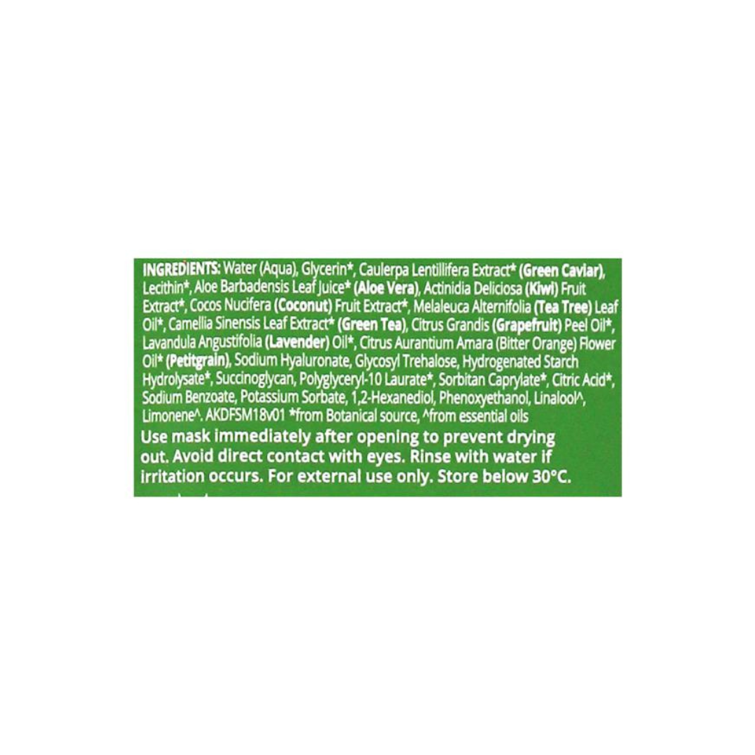 Aqua, Glycerin, Caulerpa Lentillifera (Green Caviar) Extract, Lecithin, Aloe Barbadensis Leaf Juice, Actinidia Deliciosa (Kiwi) Fruit Extract, Cocos Nucifera (Coconut) Fruit Extract, Melaleuca Alternifolia (Tea Tree) Leaf Oil, Camellia Sinensis (Green Tea) Leaf Extract, Citrus Grandis (Grapefruit) Peel Oil, Lavandula Augustifolia (Lavender) Oil, Citrus Aurantium (Bitter Orange) Flower Oil, Sodium Hyaluronate, Glycosyl Trehalose, Hydrogenated Starch Hydrolysate, Succinoglycan, Polyglyceryl-10 Laurate, Sorbitan Caprylate, Citric Acid, Sodium Benzoate, Potassium Sorbate, 1,2-Hexandiol, Phenoxyethanol, Linalool, Limonene. AKDFSM18v01.