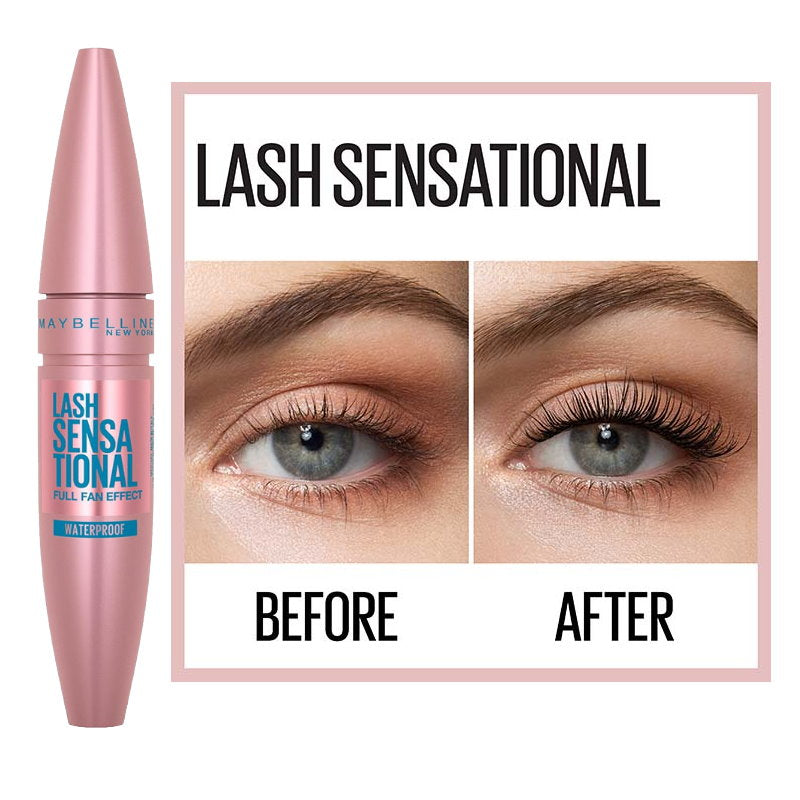 Get a sensational full-fan effect with Maybelline Lash Sensational Waterproof Mascara! Whether your lashes are sparse, straight, unruly or short, this unique fanning brush works to capture every single lash from root-to-tip. This volumizing and curling mascara is ophthalmologist tested and safe for contact lens wearers.