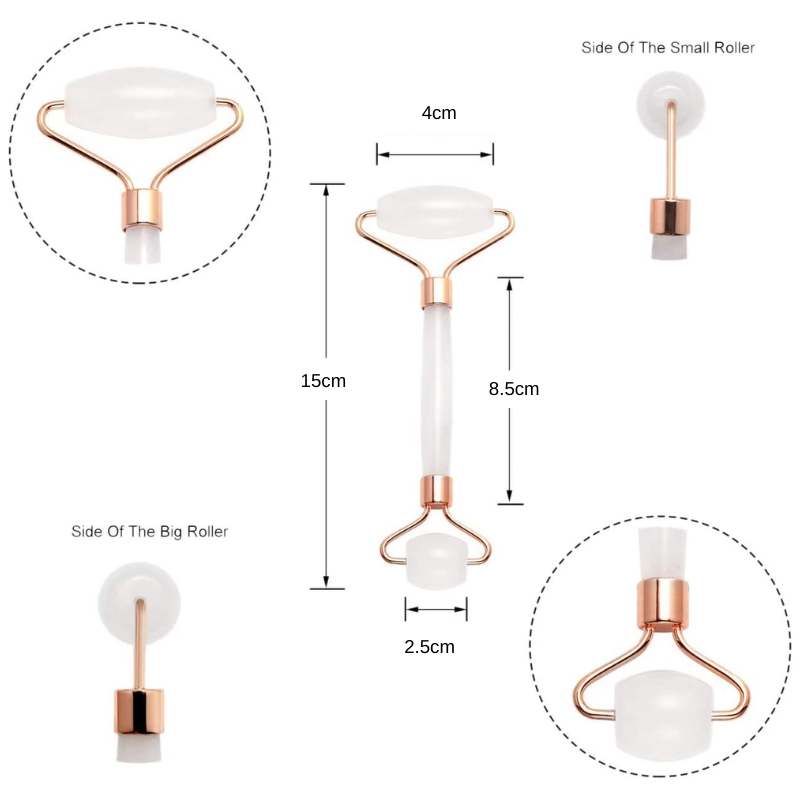 After using your moisturiser, facial oil or serum start on your neck. Proceed to roll from your jawline up to your cheekbone. Then roll from your forehead up to your hairline. Use the small head roller across your eyebrows.